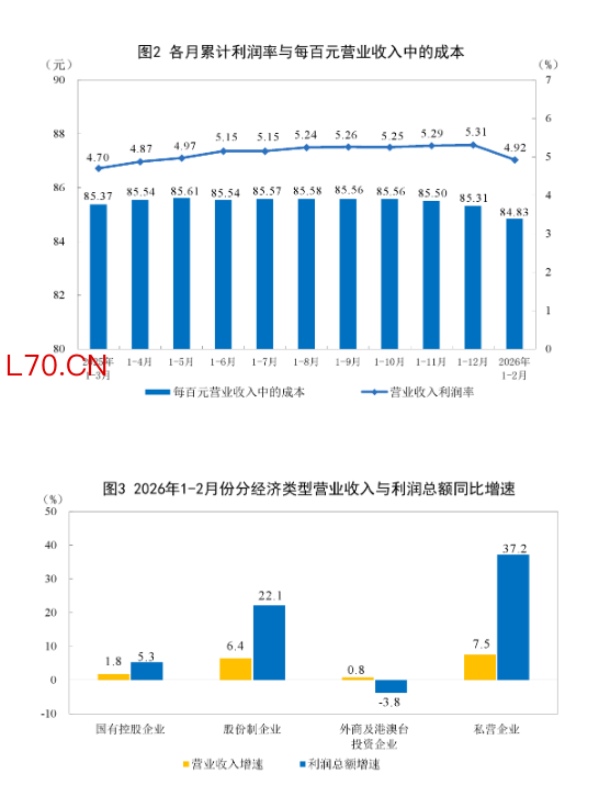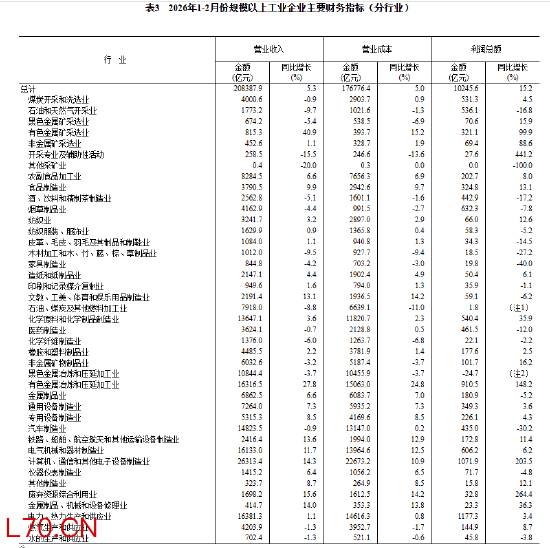 1—2月份,采矿业实现利润总额1556.1亿元,同比增长9.9%;制造业实现利润总额7321.5亿元,增长18.9%;电力、热力、燃气及水生产和供应业实现利润总额1368.0亿元,增长3.7%。