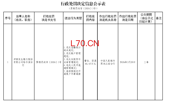 民生银行哈尔滨分行被罚66.65万元:违反金融统计相关规定等